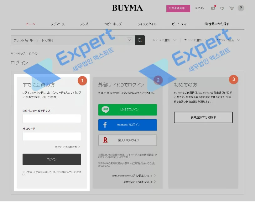 기존 계정이 있다면 아래 이미지의 ①번에서, 라인/페이스북/라쿠텐 계정으로 로그인하려면 ②번에서 로그인하고, 계정이 없다면 ③번에서 회원 가입 후 진행