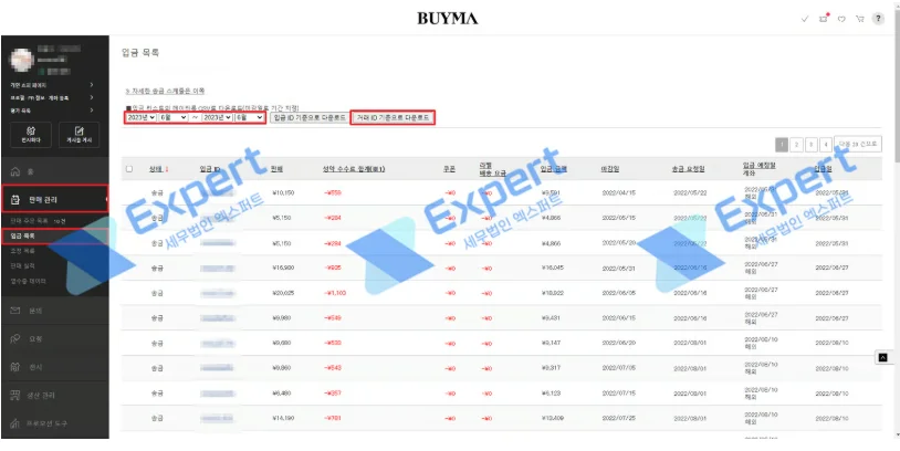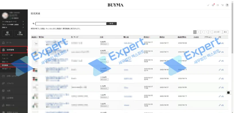 판매자 페이지로 접속해 [판매 관리(販売管理)] - [판매 실적(販売実績)] 메뉴로 들어가 판매 내역 확인
