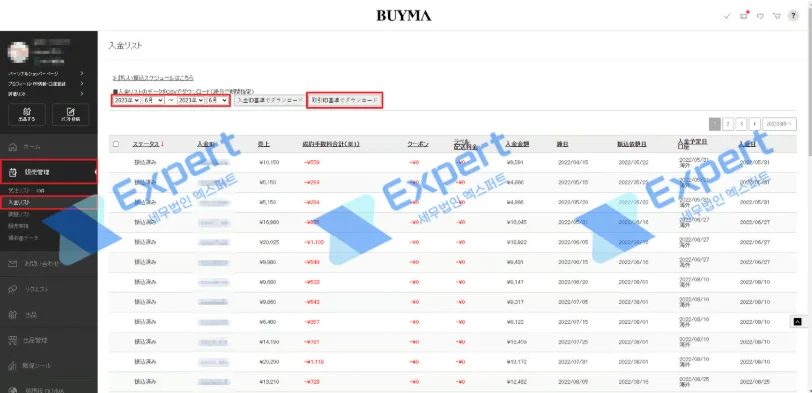 입금된 내역은 [판매 관리(販売管理)] - [입금 목록(入金リスト)]에서 조회