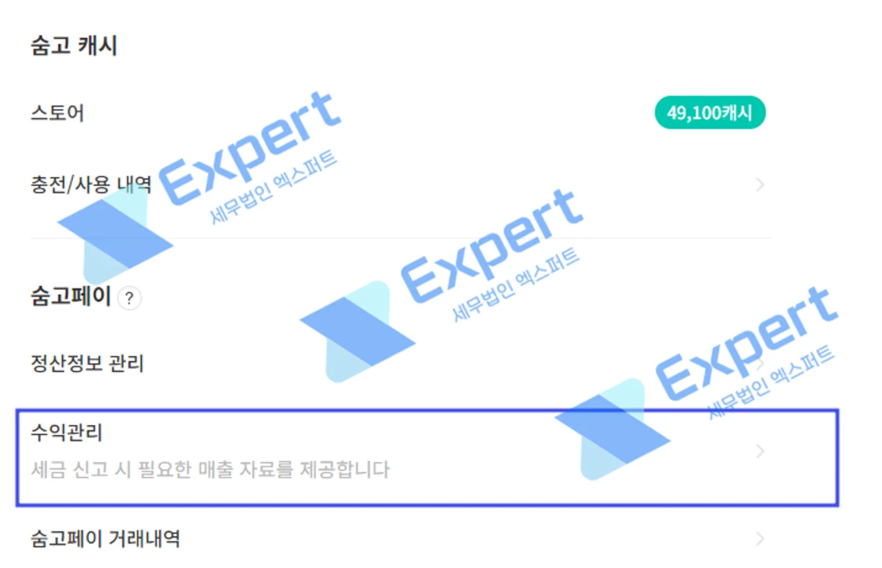 두 번째 메뉴 숨고페이 > 수익관리 클릭