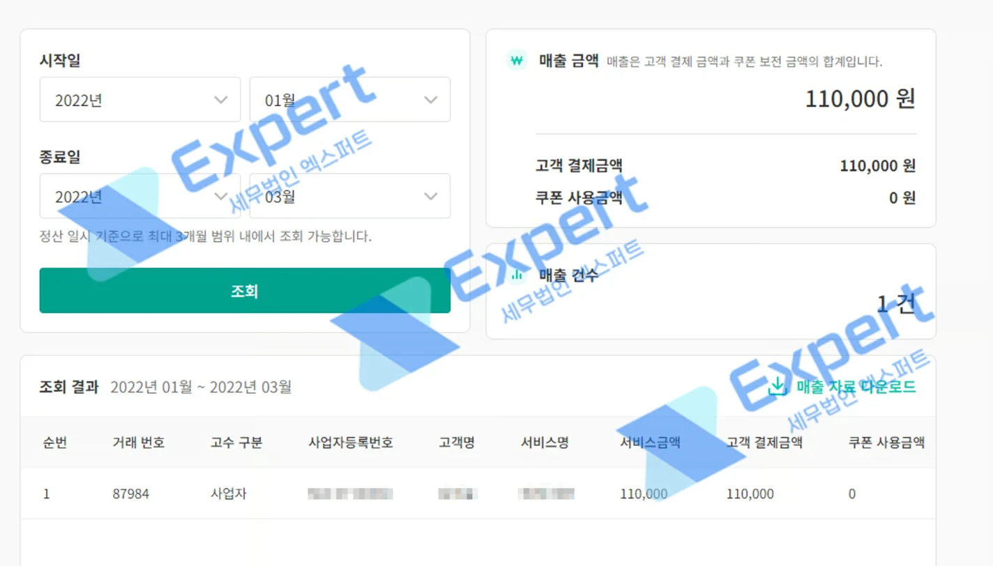 조회결과 오른쪽 매출 자료 다운로드 선택