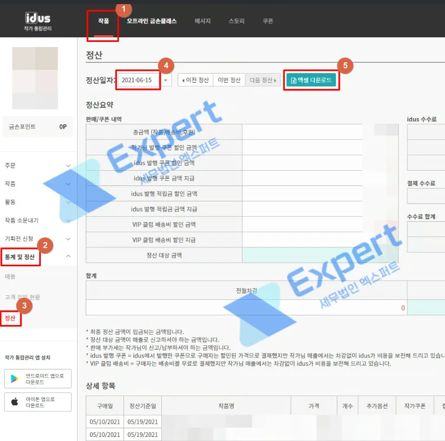 [전체] - [통계및정산] - [정산내역] - 정산일자 설정* 후 조회