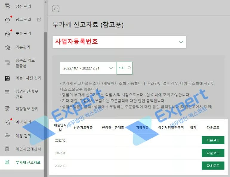 부가세 신고 자료는 최대 3개월까지 조회 가능하고, 기간 직접 설정하실 수 있습니다.