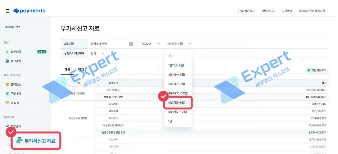 [결제 조회] 메뉴 중 [부가세 신고 자료] 선택해 매출 자료 조회
