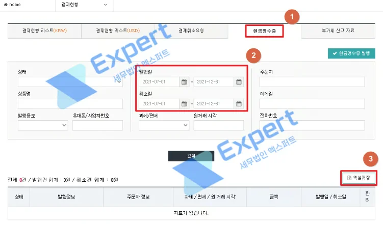 현금영수증 매출 확인 - [현금영수증] - 발행일, 취소일 기간 설정(부가가치세 자료 조회 기간과 동일) - [검색] - 매출 내역 있다면 [엑셀 저장]