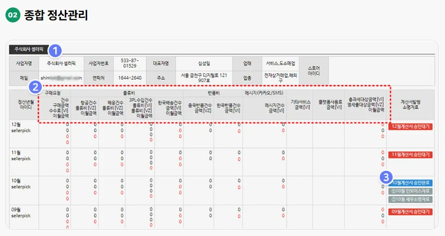 셀러픽 [운영관리] > [정산관리] 메뉴를 클릭한 후 [종합정산관리] 메뉴로 조회 가능